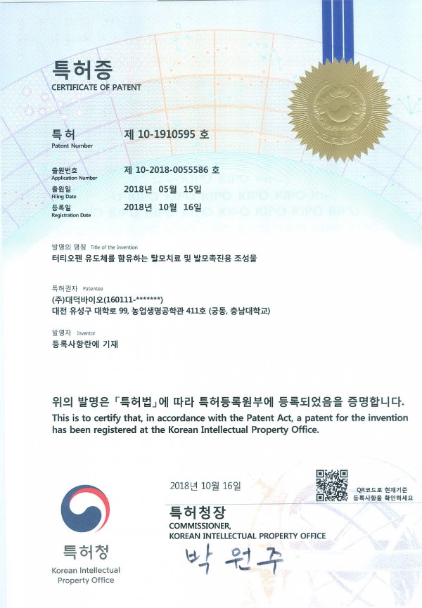 상기 발명의 특허번호는 제10-1910595호이며 등록일자는 2018년 10월 16일이다. 발명의 명칭은 '터티오펜 유도체를 함유하는 탈모치료 및 발모촉진 조성물 이며 특허권자는 (주)대덕바이오이다.