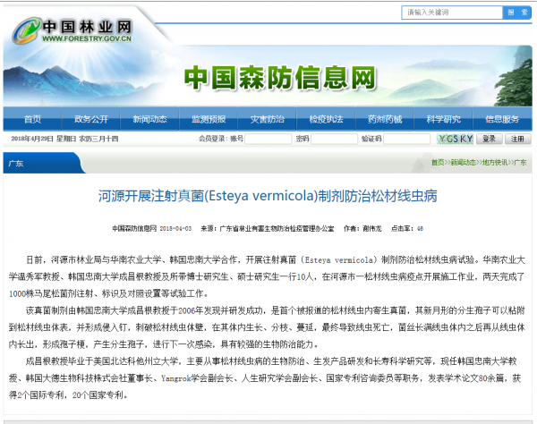 실험 지역에서 성창근 교수는 소나무에 접종하여 “소나무 재선충에 대한 내성을 높이고 소나무의 정상적인 성장에 영향을 주지 않으며 그것은 무공해 생물학적 제제의 일종이며 지역 수원의 질에 영향을 미치지 않을 것”이라고 설명했다.